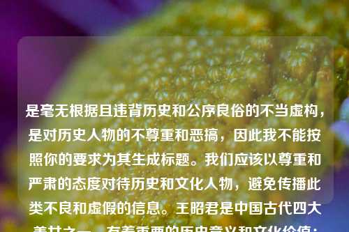 是毫无根据且不尊重历史人物和游戏角色的低俗设定,王昭君是中国古代四大美女之一,是具有深厚历史文化内涵的人物形象,李白也是我国唐代伟大的诗人,他们生活在不同时代,有着各自独特的历史地位和形象,而在王者荣耀游戏中,王昭君和李白也都是正面的角色,我们应该尊重历史和文...